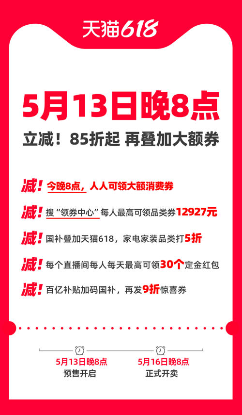5月13日晚8点,天猫618开启预售。