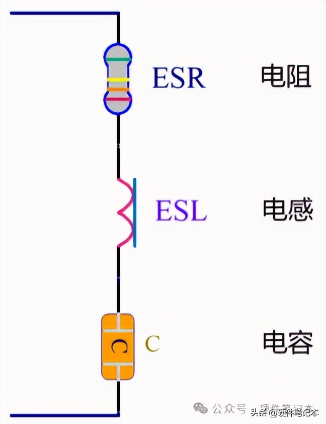 如上图所示,ESR是电容的串联等效电阻,ESL是电容的串联等效电感,C是真正的理想电容。其中ESR和ESL是由电容的制造工艺和材料决定的,无法人为消除。ESR影响电源的纹波,ESL影响电容的滤波频率特性。