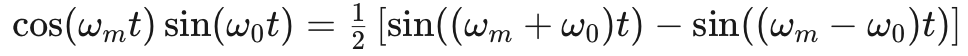 公式9该信号的频谱由位于 ±(fc+fm) 的两个冲击组成。这些对应于图4中的上边带分量。
