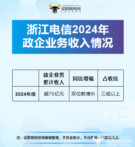 据了解,在2024年度前8个月中,浙江电信的政企业务累计收入超过70亿元,在集团中高居第4名,同比实现双位数增长,而占营收的比例超过三成以上。
