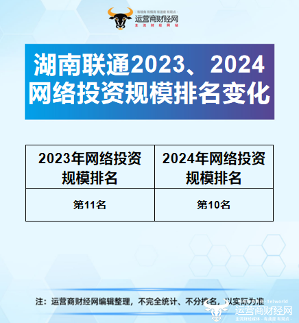 近日,根据运营商财经网独家整理推出的“中国联通2024年省公司网络投资前十名”排行榜,湖南联通恰好位列第10名。这一名次相较于2023年度,湖南联通可谓实现了不小的进步,接下来试图展开介绍。