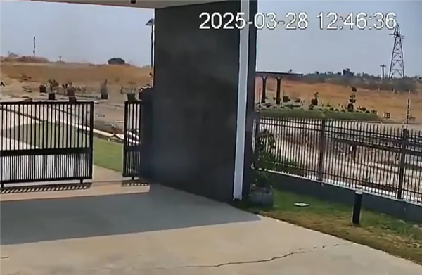 监控画面显示,一家工厂大门右上方地表断层在地震瞬间发生了剧烈位移,整片区域像是被从中间撕裂一般,而在远处,金属高压电线的铁塔也直接拦腰弯折了下去。