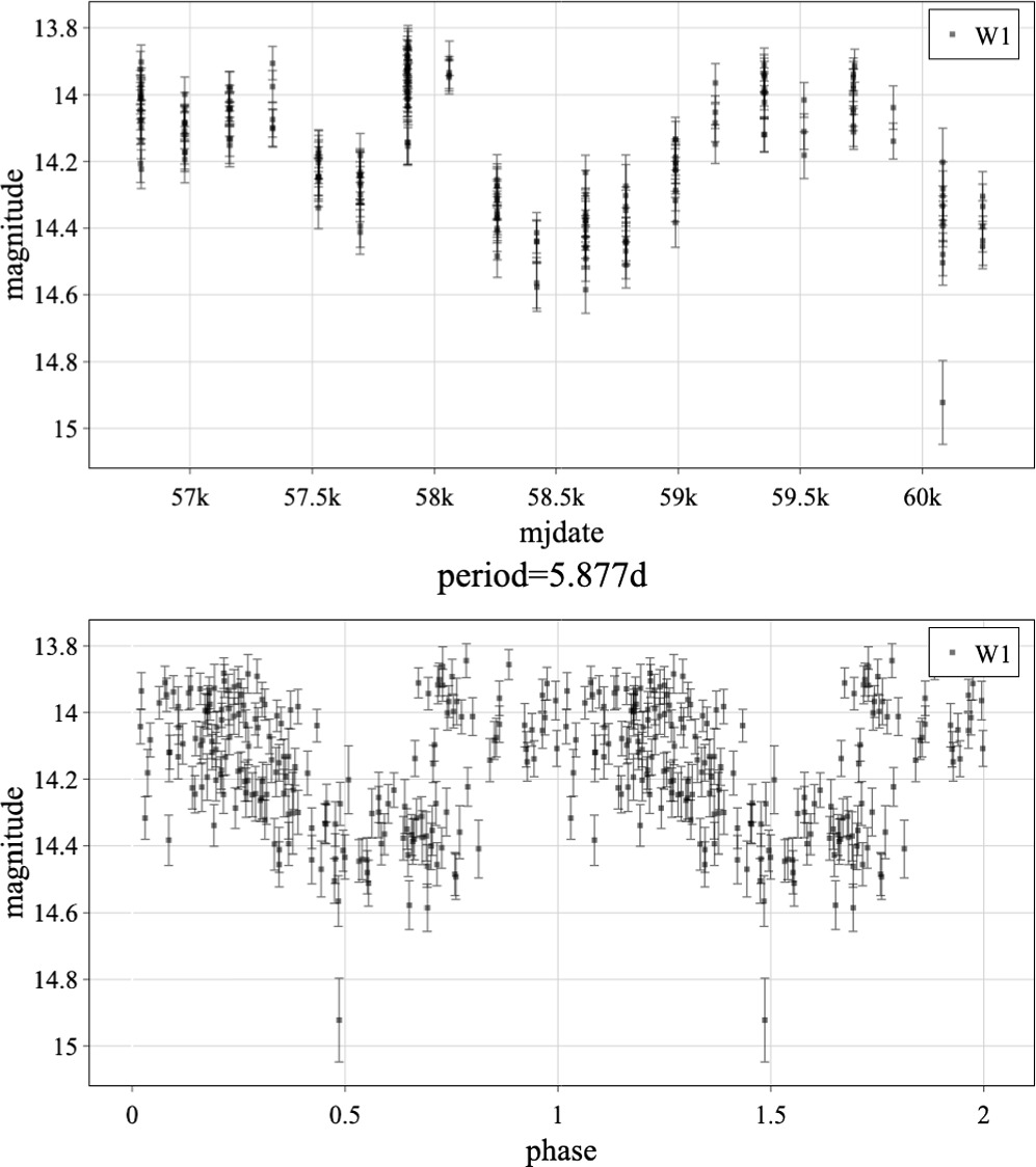 图丨 J2000 赤经/赤纬 1.53483,−59.08751 处双星系统的光变曲线。底部曲线以 5.877 天为周期进行相位折叠(来源:The Astronomical Journal)