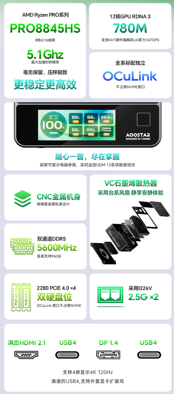 GEM12+Pro迷你主机配备AMD锐龙7 Pro 8845HS处理器,采用Zen 4架构,8核心16线程设计,单核最高频率5.1GHz,内置Radeon 780M核显。配备双SO-DIMM DDR5内存插槽,至高支持96GB内存。存储方面内置2个PCIe 4.0x4 NVMe接口,支持2个2280规格固态硬盘。