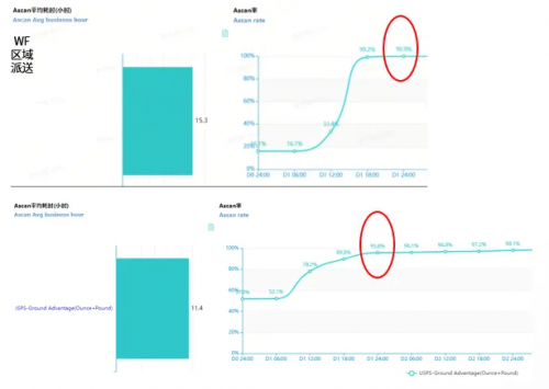 Ascan表现更优!区域供应商在ZONE ABCD的Ascan,在Day1 18:00即可完全赶超USPS,达到99.2%,Day1 24:00可达99.9%;(同时期相同范围对比USPS GA, Day1 18:00为89.8%,Day1 24:00 为95.8%)