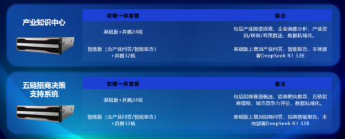 城知科技产业知识中心一体机提供多样化的软硬一体套餐,基础版搭配昇腾 24 核,满足基础的产业分析和数据服务需求;智能版在此基础上升级,搭载昇腾 32 核,增加产业问答、智能报告等功能,并可本地部署 DeepSeek R1 32B 大模型,实现更强大的智能服务。企业和政府部门可根据自身需求灵活选配,真正做到按需定制。