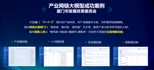 厦门市发展改革委员会运用城知科技产业知识中心一体机打造“4+4+6”现代化产业体系。为招商主管部门提供可视化大屏,辅助产业分析决策;为招商人员提供五链情报功能,助力精准招商,推动了当地产业的高质量发展。