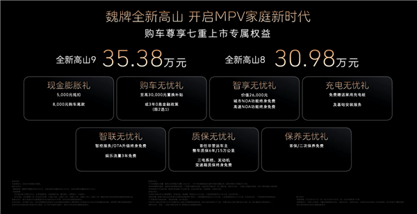快科技5月13日消息,刚刚,长城汽车高端新能源MPV车型魏牌高山上市,其共推出三款车型,分别为高山7/8/9,其中8和9的价格为30.98万元、35.98万元,相较于预售直降2-2.5万元。