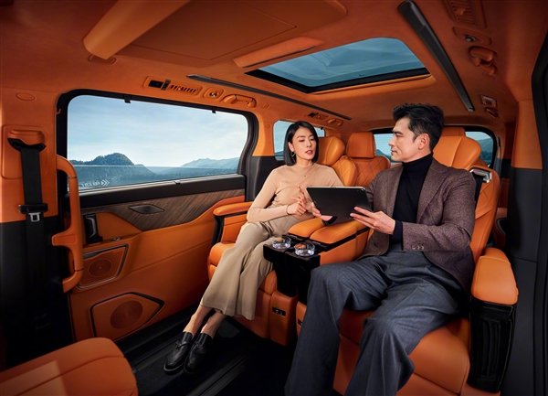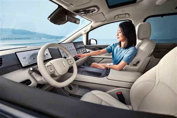 内饰全面焕新,整体风格看齐魏牌新蓝山,配有全液晶仪表盘,前排中控屏与副驾屏均为双15.6英寸2.5K屏,同时还提供SR-HUD抬头显示和高清流媒体后视镜,搭载车规级8295芯片,后排也配有17.3英寸3K超高清屏。