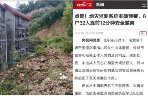 2019年8月6日早6时38分,航天惯性安全监测平台在两小时内发出连续报警信号15次。相关人员火速到达现场,紧急疏散当地居民。6时58分,滑坡灾害发生,未造成人员伤亡。人民日报、央视网等媒体进行了专题报道,在行业内引起强烈反响。