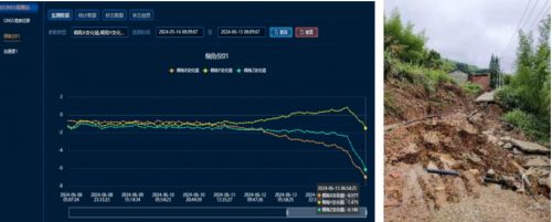 2024年6月15日8时39分,受暴雨影响,福建省南平市松溪县茶平乡吴山头村监测点的GNSS设备发出了黄色预警,受到威胁的30户共计52人得到及时转移安置,后经核实现场发生了近5000方的滑坡,因预警闭环处置及时未造成人员伤亡。