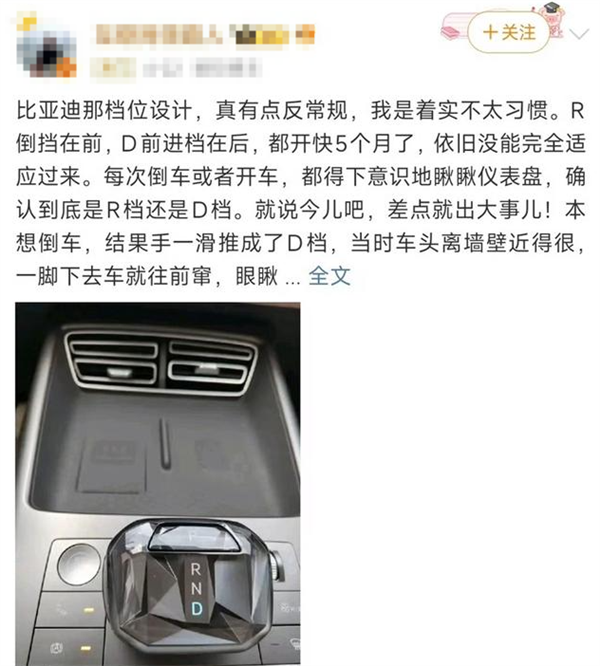 事件起因是有个博主发了一条微博,吐槽比亚迪的换挡杆设计很奇怪,R挡在前,D挡在后,跟一般的车不一样,容易让人搞错。