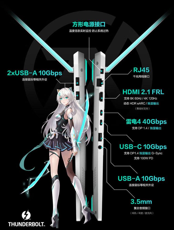 华硕天选6 Pro拥有3个USB-A 10Gbps、1个USB-C 10Gbps接口以及一个雷电4 40Gbps接口,双C口均支持DP 1.4,可以实现独显输出,可以实现多显示器的扩展。