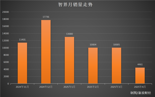 新浪科技梳理智界品牌近半年来的销量数据发现,其在2024年12月销售为17736辆达到巅峰。但今年以来,销量数据下滑明显——1月为13000辆,今年2月和3月则分别为10004辆和10005辆。