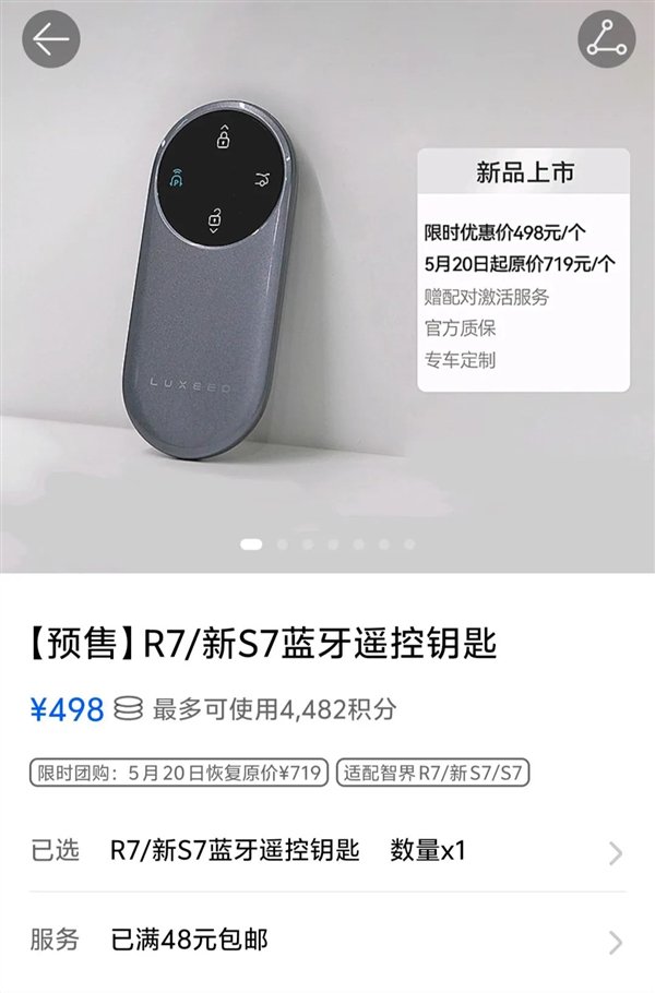 新浪科技在鸿蒙智行App上看到,官方上线了智界R7/新S7/S7蓝牙遥控钥匙的售卖链接,原价719一个。目前团购价为498元,5月20日将调回原价。