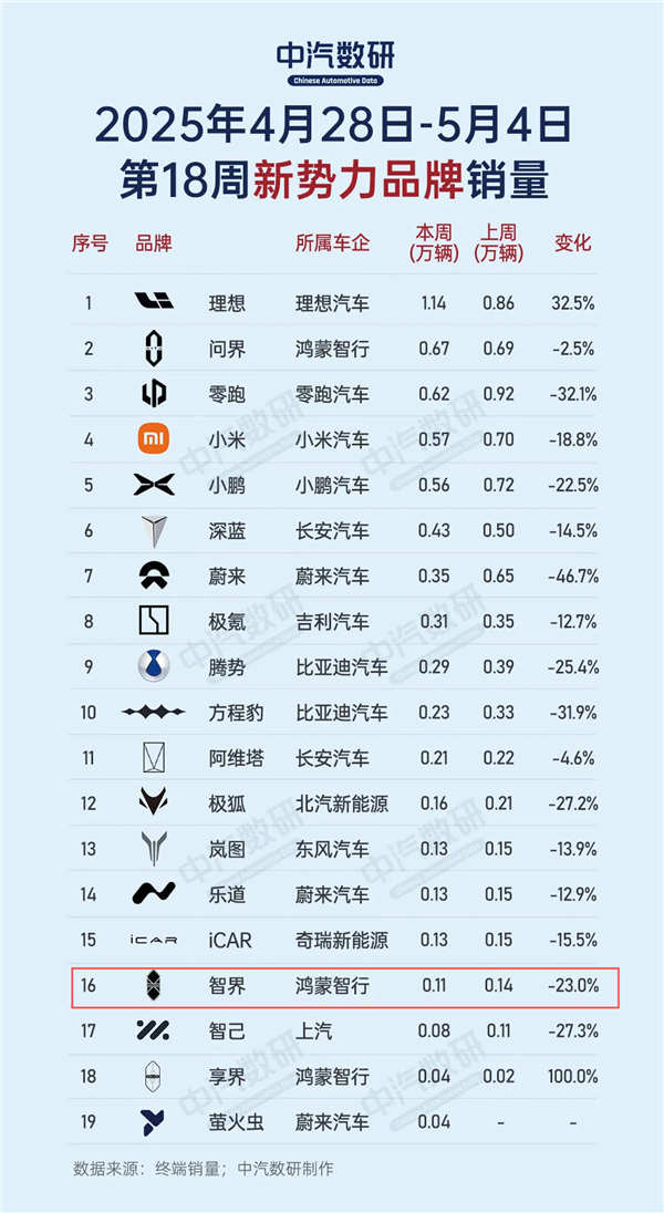 值得注意的是,根据中汽数研发布的第18周(4月28日—5月4日)新势力品牌销量数据,智界的表现依然不太理想,当周销量为0.11万辆,环比下滑23%。
