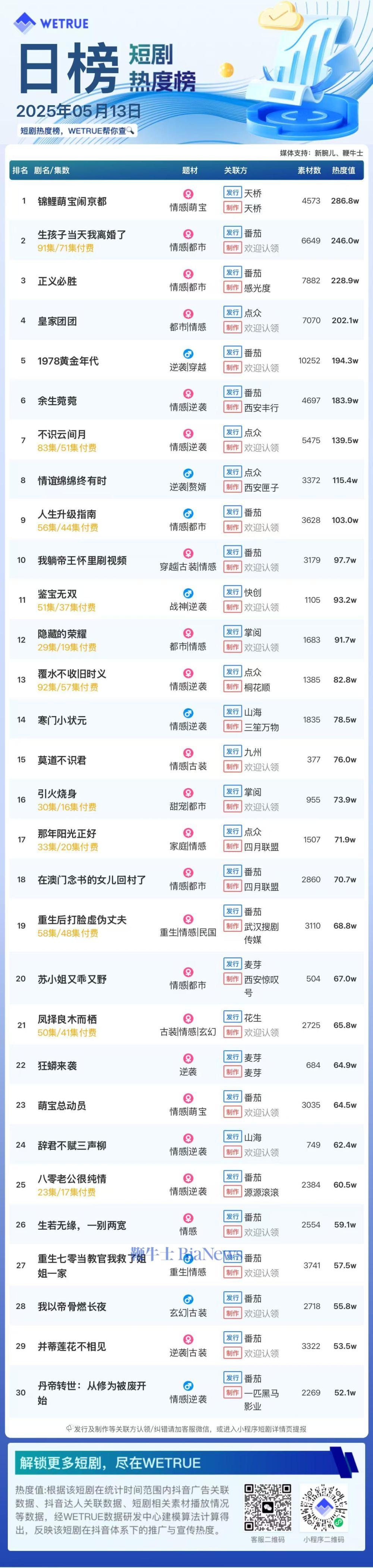 13日短剧热度榜:《锦鲤萌宝闹京都》连续五日第一,大盘热度5640万
