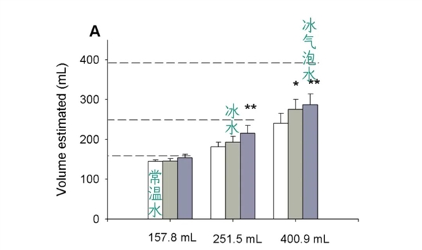 (注:当地市售的一款只有水和二氧化碳的气泡水,二氧化碳含量为 8 克/升。)结果显示,先喝冰气泡水的人后续喝的常温水最少,其次是冰水,最后是常温水。这表明冰气泡水对缓解口渴的效果最好,其次是冰水,常温水最差。