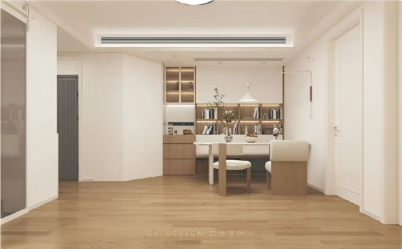 餐厅上采用了一体化的卡座+半开放式书房的设计
