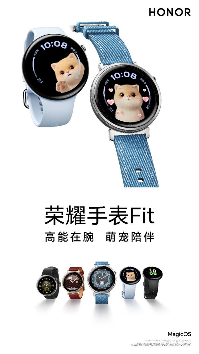 5月13日,荣耀官方微博释放新款智能手表荣耀手表Fit的外观海报。海报信息显示,荣耀手表Fit采用圆形表盘设计,带来雅致版和活力版两种不同风格造型,提供5种配色款式可选,表盘新增萌宠主题。新品预计将于本月底发布,目前已在各大电商平台开启预约。