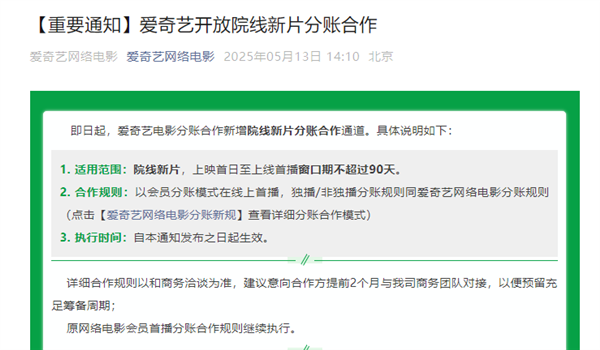 这一政策适用于从上映首日至上线首播窗口期不超过90天的院线新片,允许这些影片在爱奇艺平台上以会员分账的模式进行在线首播。