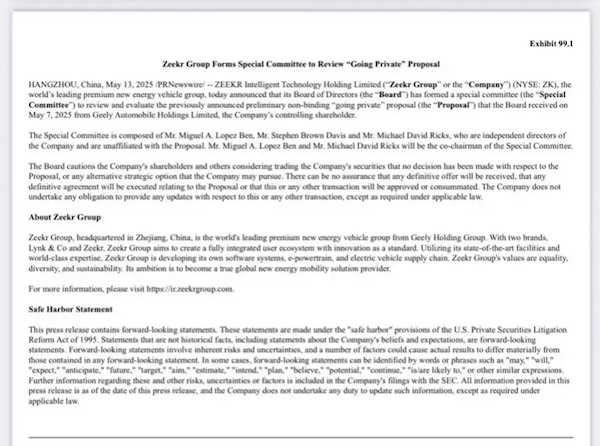 据公告,极氪董事会于5月7日收到吉利汽车控股有限公司的初步非约束性私有化提案,目前审议工作刚刚启动。