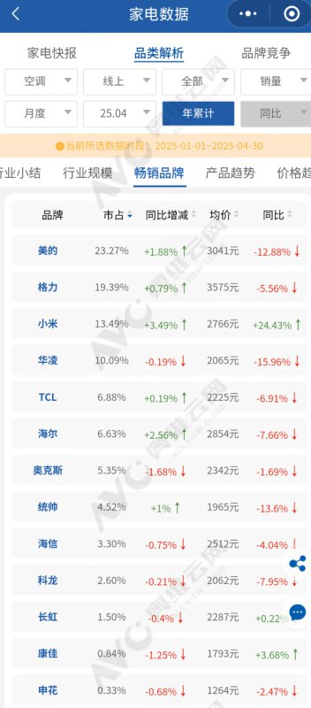 美的以23.27%的市占率稳居榜首,同比增长1.88%,其均价同比下降12.88%至3041元,显示出“高性价比+技术升级”的双重策略。
