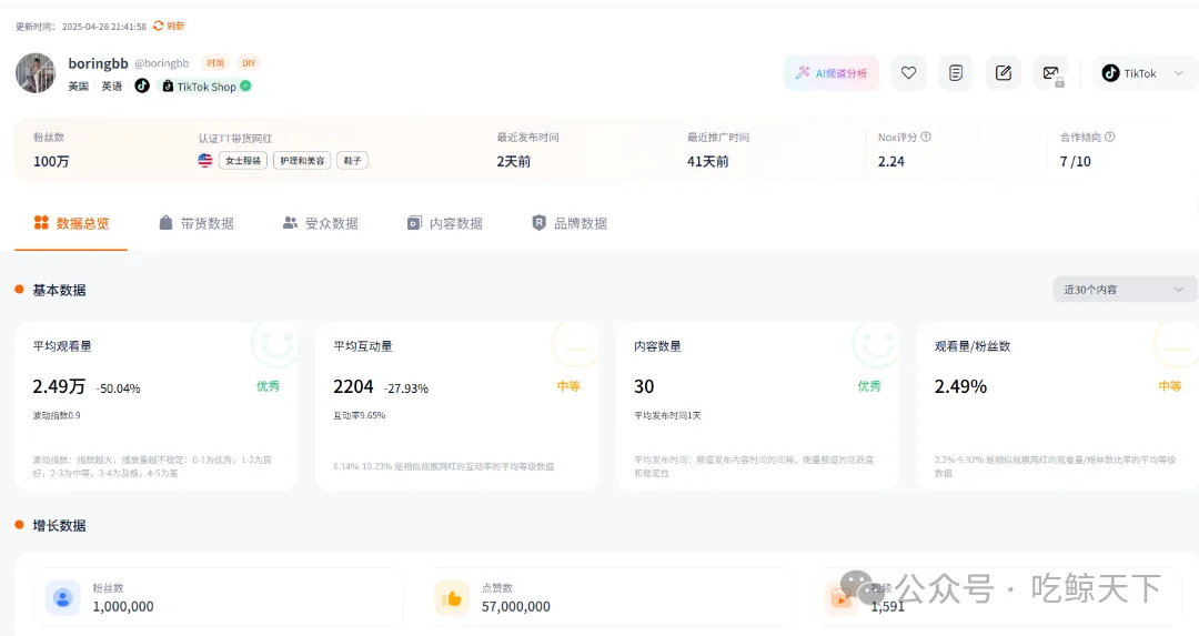 @boringbb是美国一个时尚领域博主,粉丝量超百万,会自己设计服装并担任裁缝。视频中经常提及和grandma相关的内容,给观看者以自信、积极、亲切的印象。