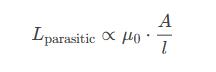 1. 环路面积与电感关系:根据法拉第电磁感应定律,导线环路面积越大,寄生电感(LparasiticLparasitic)越高,公式为: