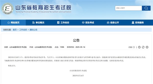 2025年5月10日上午,我省春季高考知识考试开考。当天早上,山东省城市服务技师学院考生姜某在与同学乘车赴考点途中,因抢救并护送突发心梗的同学就医耽误参加首场语文考试。当地教育招生考试单位和山东省城市服务技师学院核实情况属实。经报请上级主管部门同意,将按照规定程序启用春季高考语文科目副题,安排姜某参加考试。