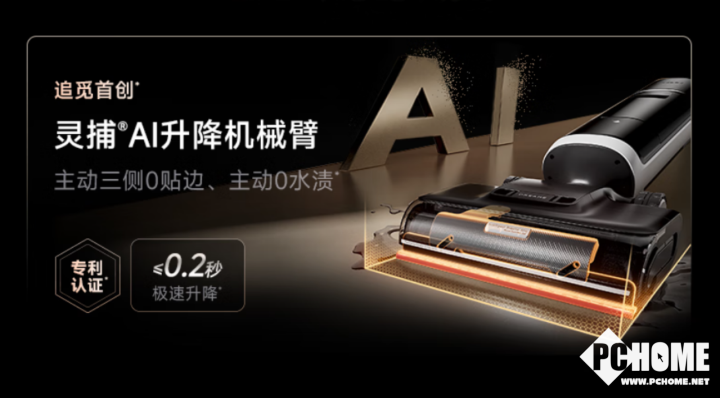 日常使用洗地机时,会出现边角死角难以清洁到位、地面水渍残留等等问题。追觅行业首创的灵捕智能升降机械臂技术,通过智能算法识别洗地机运行状态,当用户推行至边角处回拉时,机械臂会向下加压吸除脏污垃圾,并且会自适应贴地产生下压力,将死角垃圾和地板残留水渍直接带走。真正实现了0贴边、0水渍清洁效果。用户不再需要二次手动清洁,更省时省力。