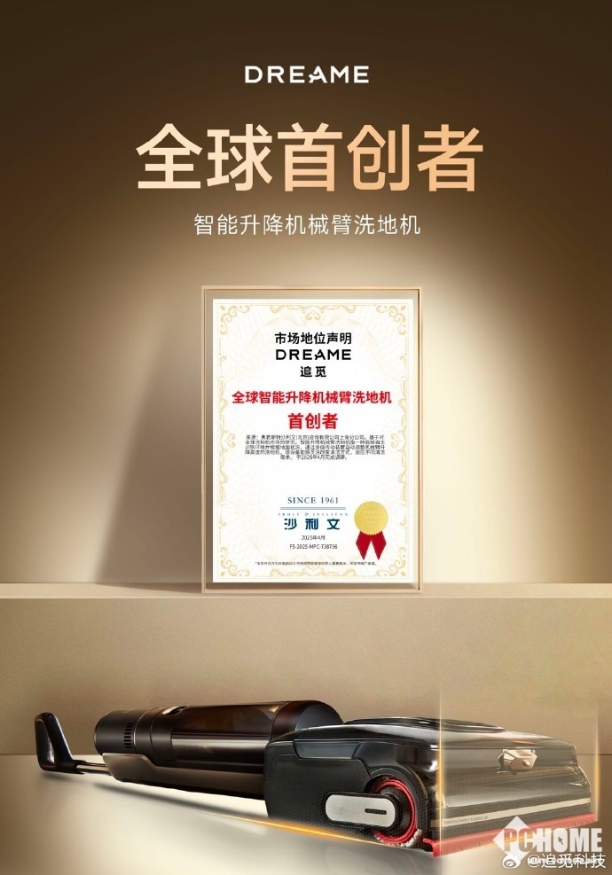 追觅洗地机荣获国际权威咨询机构沙利文认证——「全球智能升降机械臂洗地机首创者」。