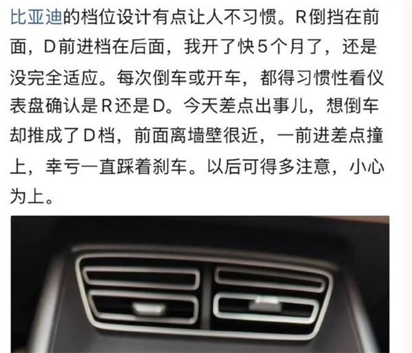 快科技5月14日消息,此前,有网友向比亚迪新闻打假办公室提供线索,称有些账号在不同平台上吐槽比亚迪倒车挡与前进挡的位置设计有误。