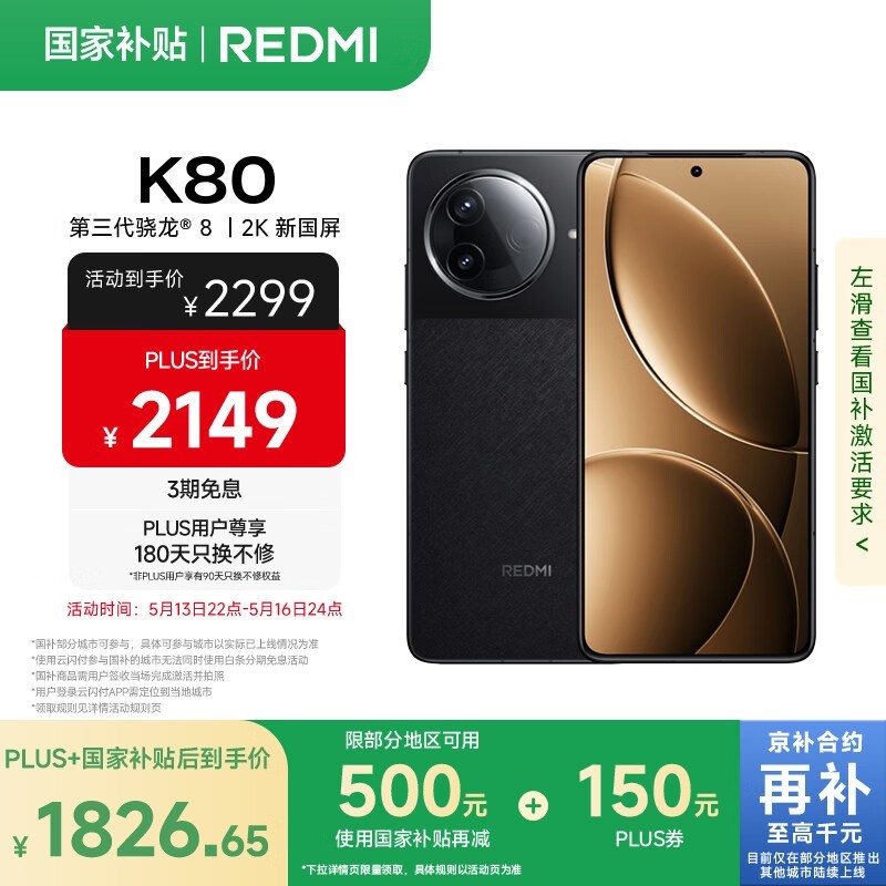 红米K80(16GB+256GB玄夜黑)超值优惠价1816元!