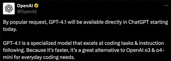 快科技5月15日消息,OpenAI在X平台正式官宣ChatGPT迎来重大升级,新一代GPT-4.1模型全面上线。