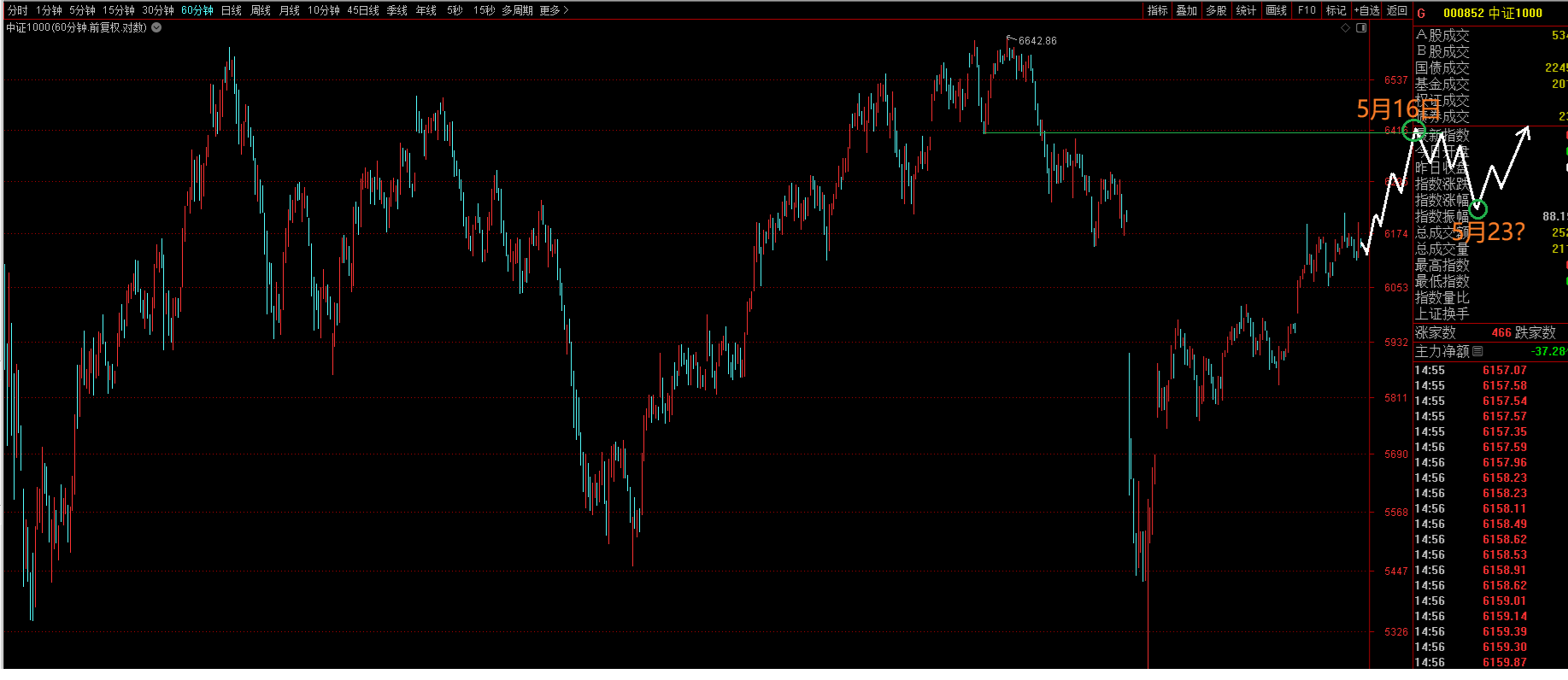“今天5月14日,是上周预测的三大指数短线高点时间,下午还有潜力继续冲高,最迟明天逐渐回落、整固。而中小微盘股为主成分大盘指数,高点在5月16日,所以今天整固后,逐渐进一步冲高直至五月16日。”