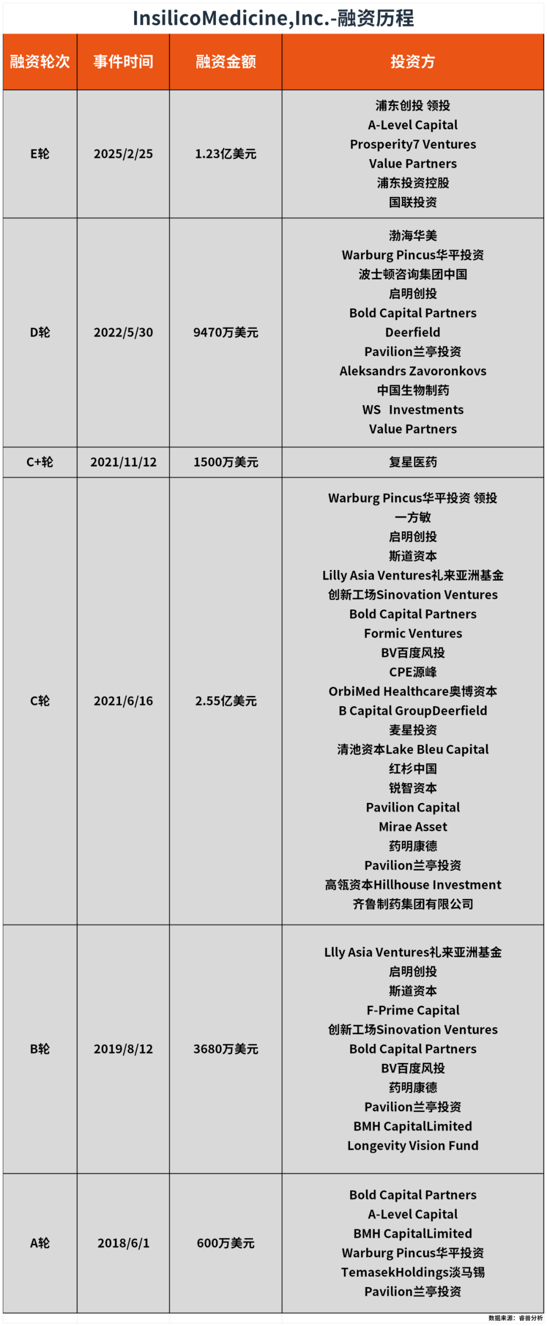 2025年初,公司宣布获得浦东创投领投,惠理基金和华平投资跟投的E轮融资,投后估值超13亿美元,跻身独角兽行列。2025年5月,英矽智能再次递表港交所。