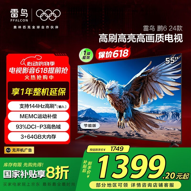 雷鸟鹏6 24款55英寸电视大促:1074元入手