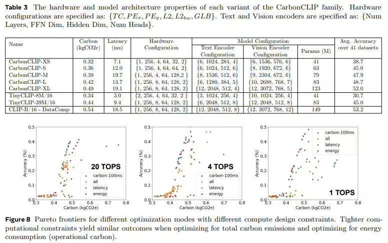 特别针对边缘推理设备,CATransformers 通过剪枝大型 CLIP 模型生成变体,并结合硬件估算工具分析碳排放与性能。其成果 CarbonCLIP-S 与 TinyCLIP-39M 精度相当,但碳排放降低 17%,延迟控制在 15 毫秒内;CarbonCLIP-XS 则比 TinyCLIP-8M 精度提升 8%,碳排放减少 3%,延迟低于 10 毫秒。