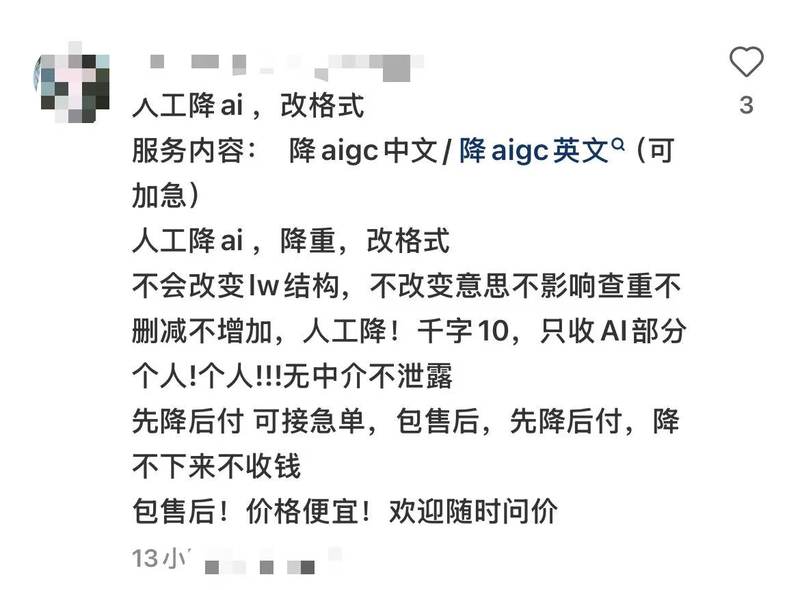 蓝鲸新闻在社交媒体中发现不少有关“AIGC率”的帖子下都有“降手”在线接单,而打出的口号也非常“意味深长”。“纯人工降”、“人工降AI”、“先降后付”……ChatGPT刚刚席卷全球时的段子“大厂员工古法手工制作PPT”似乎率先在学术圈照进现实了。