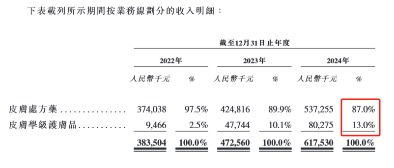 根据聆讯资料集披露,2024年,公司的87%收入来自于皮肤处方药。