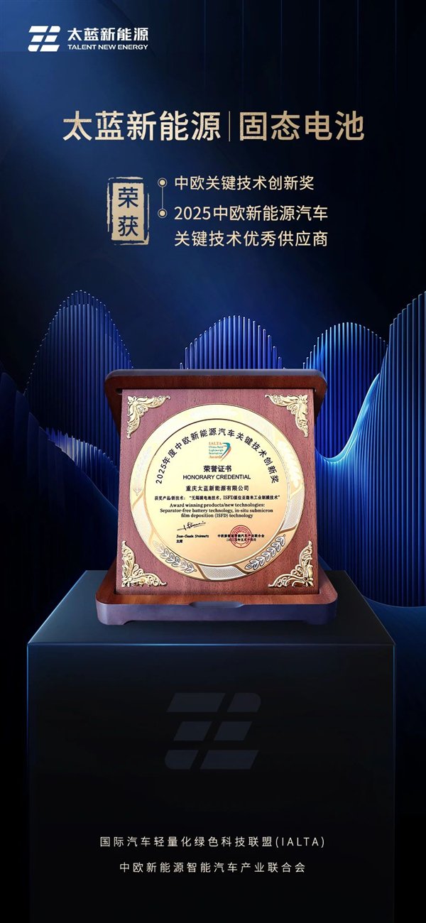 快科技5月15日消息,太蓝新能源宣布,公司凭借自主研发的固态电池原位亚微米工业制膜技术(ISFD),成功斩获“2025年度中欧新能源汽车关键技术创新奖”。