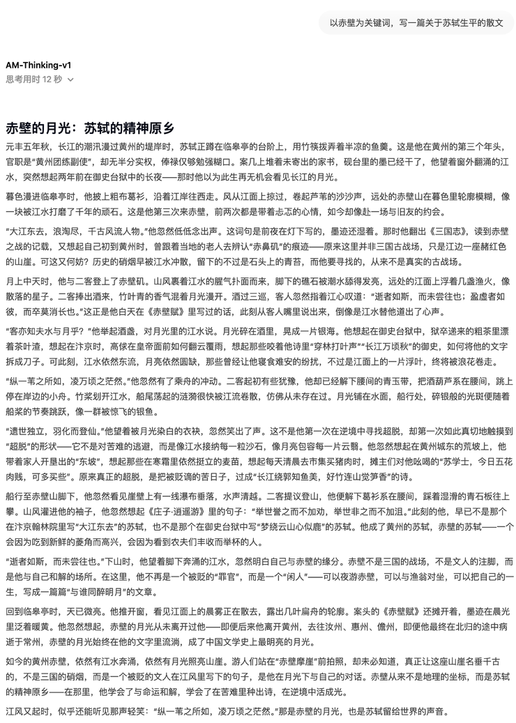 在长文本写作能力的测试中,AM-Thinking-v1 在表达逻辑和意象捕捉方面也展现出了初步的组织能力。