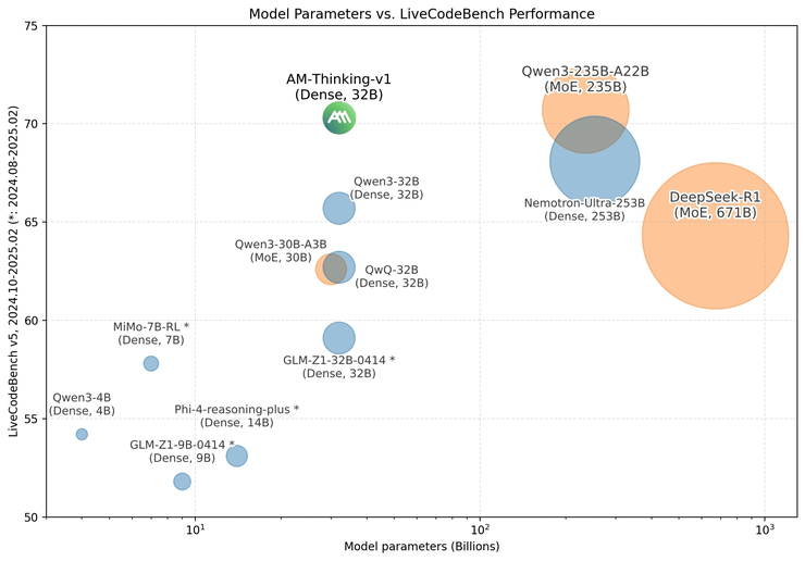 在当前主流评测中,AM-Thinking-v1 也交出了极具冲击力的成绩单,仅 32B 的结构在数学推理(AIME 系列)和代码生成(LiveCodeBench)中分别取得了 85.3 和 70.3 的高分,不仅全面超越了 DeepSeek-R1(671B MoE 架构),还逼近甚至追平了 Qwen3-235B-A22B 和 Seed1.5-Thinking 等超大规模 MoE 模型的成绩。
