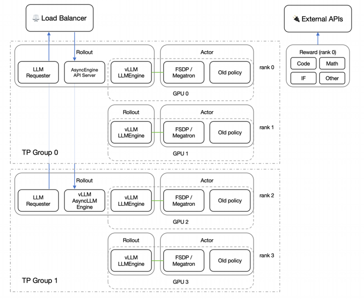 当然,为了让整个 RL 训练高效跑得动,A-M-team 还在工程上动了不少脑筋。比如他们把推理和训练分开,用了 streaming rollout 的方式,还配了个前端负载均衡器,能根据每张 GPU 的实际压力动态分配任务,最大限度避免“有的卡闲着、有的卡累死”的情况。不仅训练稳,还能大大节省时间和算力