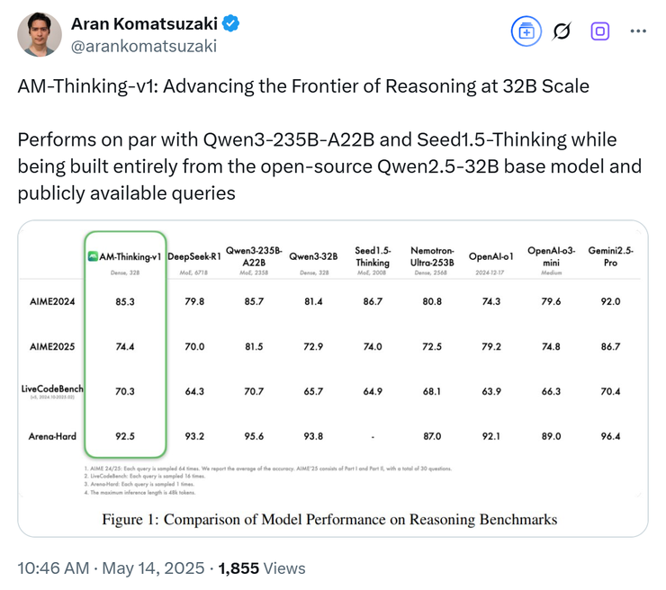 推特大 V Aran Komatsuzaki 也下场转发,并配文:AM-Thinking-v1 正以 32B 的规模推进着推理前沿性能的边界。