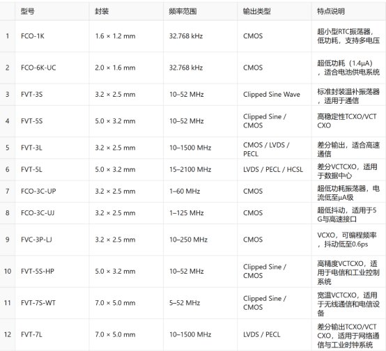 FCom致力于构建完善的时钟器件产品平台,产品涵盖无源晶体谐振器、有源晶体振荡器、温补/压控晶体振荡器、差分振荡器、超低功耗晶体振荡器等,支持从kHz至GHz的频率输出,封装覆盖从1.2×1.0mm超小尺寸至7.0×5.0mm高性能级别,满足不同电压平台、接口协议及系统架构的灵活需求。