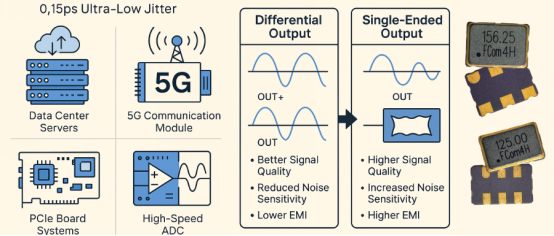FCom差分振荡器专为高速度、高信号完整性应用设计。输出接口支持LVDS、LVPECL和HCSL,频率范围13.5 MHz 至 220 MHz,典型相位抖动低至0.05~0.2 ps RMS,封装类型包含2520、3225、5032、7050等。