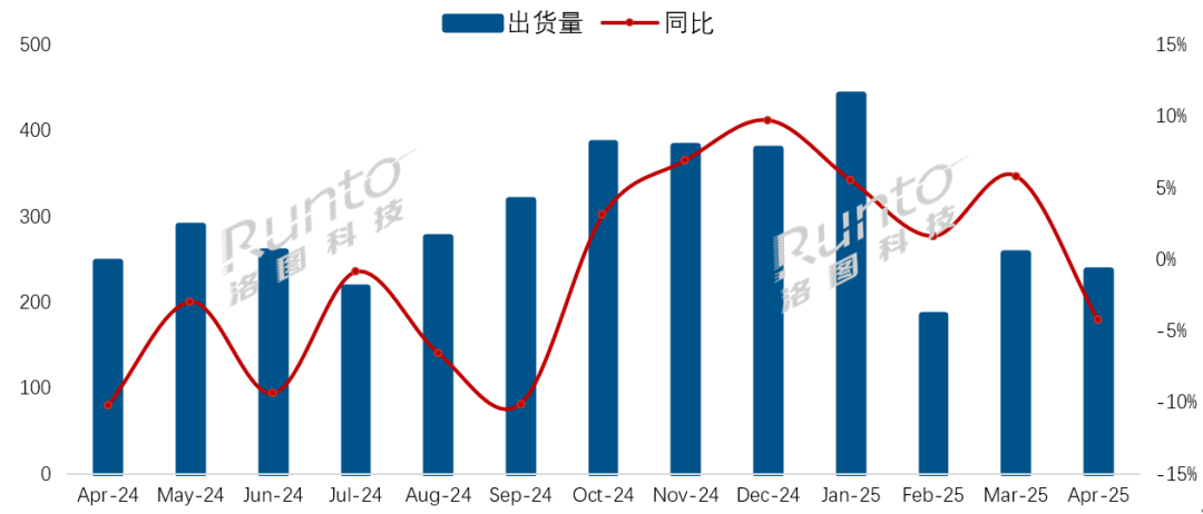 洛图科技(RUNTO)数据显示,2025年4月,中国电视机市场品牌整机出货量为236.5万台,同比下降4.3%。截至4月底,中国电视机市场品牌整机的累计出货量为1120.5万台,同比增长2.7%。