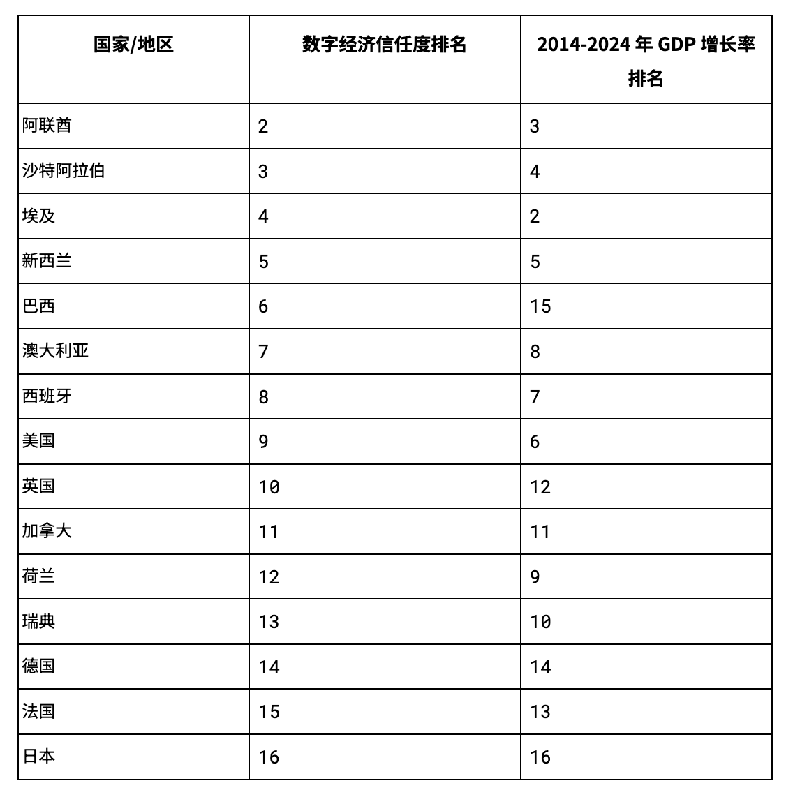 《海外数字经济信任度报告》与国家 GDP 增长率的皮尔逊相关系数 (Pearson correlation coefficient) 约为 -0.71,此负相关表明更高的 GDP 增长率往往对应更优(即数值更低)的数字经济信任排名。
